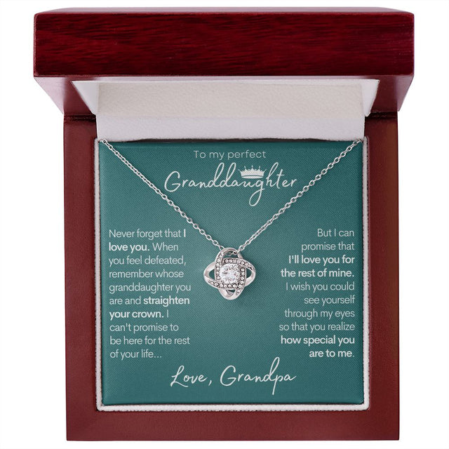 Never forget that I love you. When you feel defeated, remember whose granddaughter you are and straighten your crown. I can't promise to be here for the rest of your life...but I can promise that I'll love you for the rest of mine. I wish you could see yourself through my eyes so that you realize how special you are to me. Love, Grandpa.