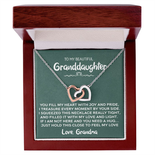 To My Beautiful Granddaughter - You fill my heart with joy and pride, I treasure every moment by your side. I squeezed this necklace really tight and filled it with my love and light. If I'm not here and you need a hug, just hold this close to feel my love. Love, Grandma.